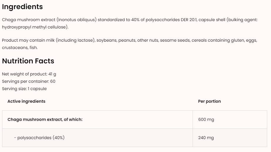 Чага, известна също като "черен гриб", е мощен натурален продукт, богат на антиоксиданти, витамини и минерали. Приемът на Chaga 600 mg капсули може да помогне за укрепване на имунната система и да осигури енергия и издръжливост, които са особено важни за активните хора. Тази гъба също така предлага редица ползи за сърдечно-съдовата система и подпомага здравето на кожата, благодарение на своите противовъзпалителни свойства.