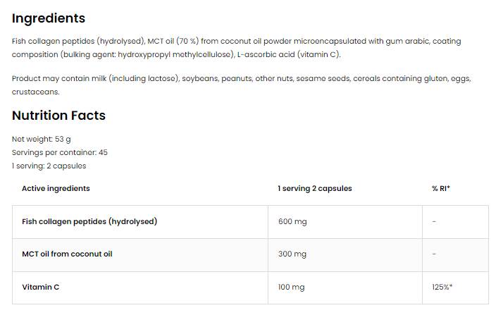 Колаген - Той е един от най-важните протеини в човешкото тяло. Той присъства в почти всички човешки тъкани. Той е основен градивен елемент за кожата, сухожилията, костите, ставите и роговицата на окото, наред с други. Влияе върху кохезията, здравината и еластичността на съединителната тъкан. Повишената физическа активност засилва процеса на разрушаване на колагена, поради което допълването му при интензивни упражнения и тренировки е много важно. Дефицитът на колаген от кожите на морските риби може да причини двигателни нарушения, схващане на ставите и болки в гърба, поява на бръчки, целулит и намалена хидратация и стегнатост на кожата. Най-полезната форма на добавка са колагенови пептиди тип I от риба с добавен витамин С.