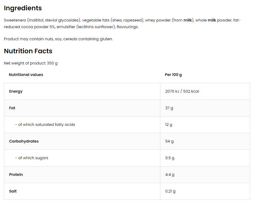 Кремето с шоколадов вкус е идеален избор за всички, които искат да увеличат приема на протеини по вкусен и удобен начин. Този спред е не само вкусен, но и изключително полезен. С високо съдържание на протеини, той подпомага изграждането на мускулна маса и ускорява възстановителните процеси след интензивно натоварване. Освен това, богатството на фибри в продукта помага за поддържане на здравословен метаболизъм и насърчава чувството за ситост.