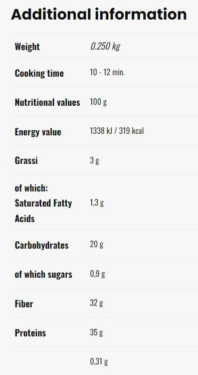 35% протеин и само 32% фибри на 100g продукт. Цифрите са достатъчни, за да опишат спецификата на нашата паста с високо съдържание на протеини, идеална за тези, които искат да увеличат процента на протеини в диетата си и да избегнат излишните въглехидрати.