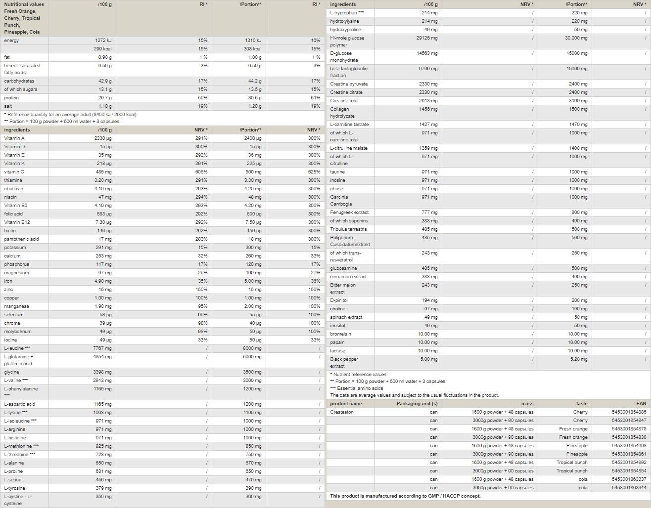 Повторно подобреният и оптимизиран CREATESTON е Hi-Tech All-in-one формула, която съдържа всички познати в момента, ефикасни хранителни и градивни субстрати, необходими за максимално увеличаване на силата и мускулната маса, при натрупване на възможно най-малко телесни мазнини.