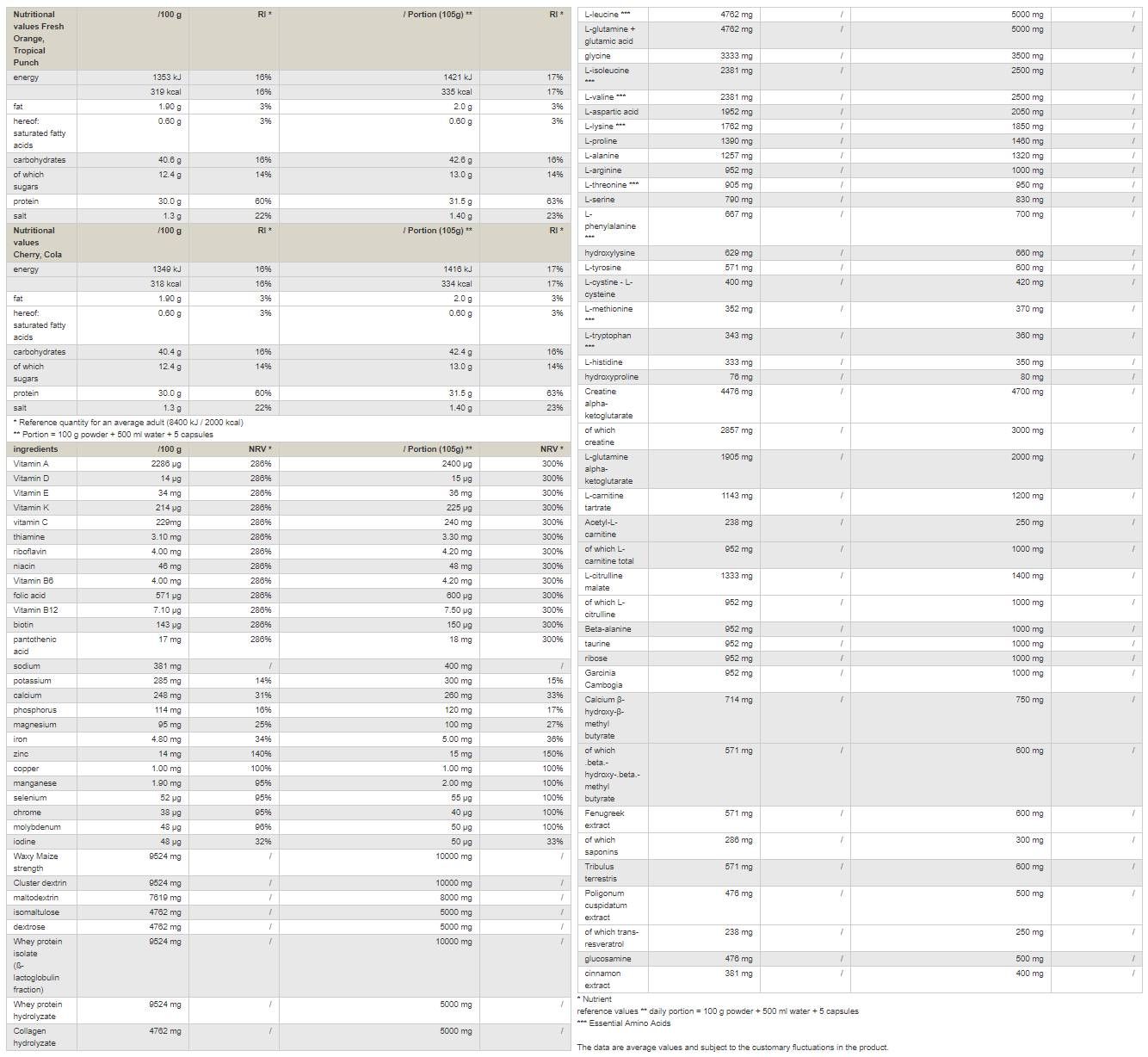 Дозировка: Приемайте 1 доза дневно, препоръчително веднага след тренировка. Почивните дни приемайте 1 доза веднага след сън сутрин. 100 грама пудра, разтворени в 400-500 мл вода, заедно с 5 капсули.