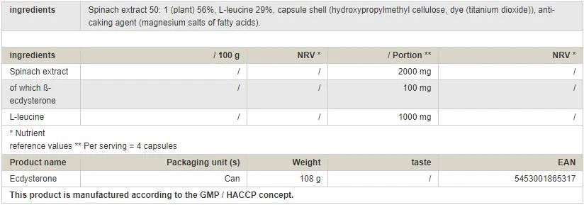 Ecdysone е нова супер добавка съдържаща L-Leucine, растителни вещества и преди всичко бета екдистерон и turkesteron. Изследванията, спортната практика, както и предаваните през поколенията народни мъдрости (от спанака ставаш голям и силен – историите за Попай) превръщат Ecdysone в УНИКАЛНА хранителна формула за развиване на сила и мускули. Ecdysone може да спомогне за по-доброто усвояване на приетия хранителен протеин като собствен телесен протеин, респ. превръщането му в мускулна маса. Бета екдистеронът е бил използван за повишаване на дееспособността още през 80-те години на миналия век от руските елитни войници и спортисти под името Mesobolin като естествен ергогеник без странични ефекти и НЕспадащ към допинг средствата.