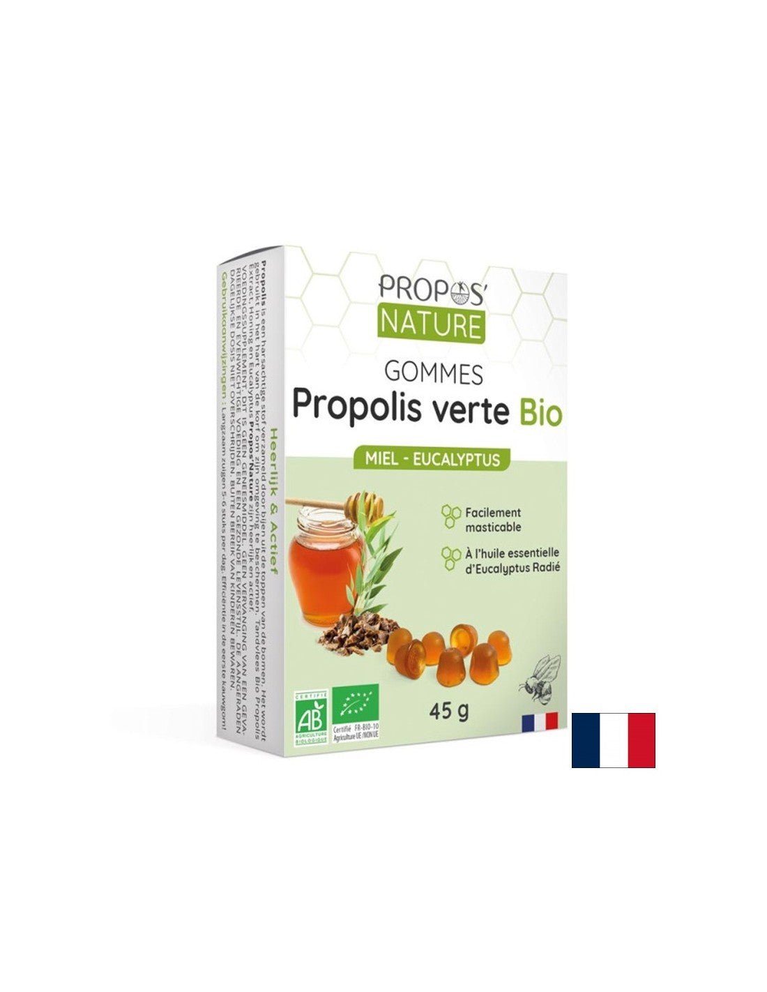 Gommes Propolis Verte Bio Miel & Eucalyptus / Зелен прополис с пчелен мед и масло от евкалипт Гъми45 g (~40 желирани таблетки) е хранителна добавка на френската компания Propos’Nature. Формулата включва активни съставки: пчелен мед, екстракт от прополис, етерично масло от евкалипт, добити и отгледани по методите на биологичното земеделие. Продуктът не съдържа глутен, оцветители и консерванти. Хранителната добавка подпомага нормалното състояние на имунната и дихателната система.