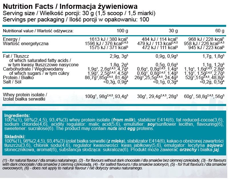 Съставки: 98% суроватъчен протеин изолат (от мляко), емулгатор: соев/слънчогледов лецитин, подсладител: сукралоза