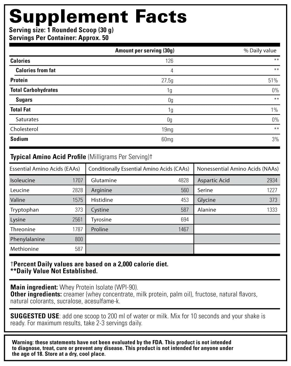 Whey Isolate е отличен източник на аминокиселини, необходими за интензивен мускулен растеж и възстановяване. Всяка доза от този протеин на прах осигурява 12 гр незаменими верижно-разклонени аминокиселини BCAA, включително 2.8 гр левцин, 5 гр глутамин и 27 гр протеин. Този богат аминокиселинен профил превръща Whey Isolate в един от най-добрите протеинови шейкове, предлагани на пазара.