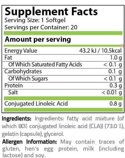 CLA е уникална полиненаситена мастна киселина. Изследванията показват, че добавянето на 2-3 грама CLA на ден спомага за намаляване на телесните мазнини дори и при редовно трениращи атлети. Ефектът се дължи на блокирането на действието на липопротеин липаза (LPL) – ензим, необходим за задържането на мазнини в организма. По този начин тялото е стимулирано да изгаря мазнините и да ги трансформира в енергия. При активно спортуващите CLA подпомага натрупването на мускулна маса дори без промяна в режима на тренировки и хранителния режим.