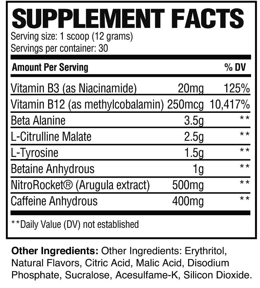 RAW Pre идва зареден със съставки, които насърчават производството на азотен оксид, притока на кръв и клетъчната хидратация. Glycersize™ подобрява хидратацията на мускулната тъкан, като допълнително насърчава интрамускулния хранителен статус. L-тирозинът и кофеинът осигуряват умствения тласък, от който се нуждаете, за да се съсредоточите върху тренировката си и да доминирате от началото до края. Заедно тези съставки се комбинират, за да поддържат готова за производителност среда за работещи мускули и продължителни контракции.