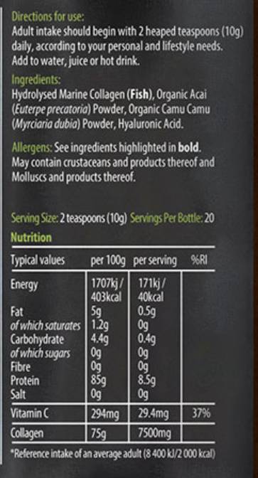 Хидролизиран морски колаген : Тип I колаген, извлечен от диви риби, уловени устойчиво от крайбрежието на Франция. Хидролизираната форма осигурява по-добра абсорбция и е нежна към храносмилателната система.
