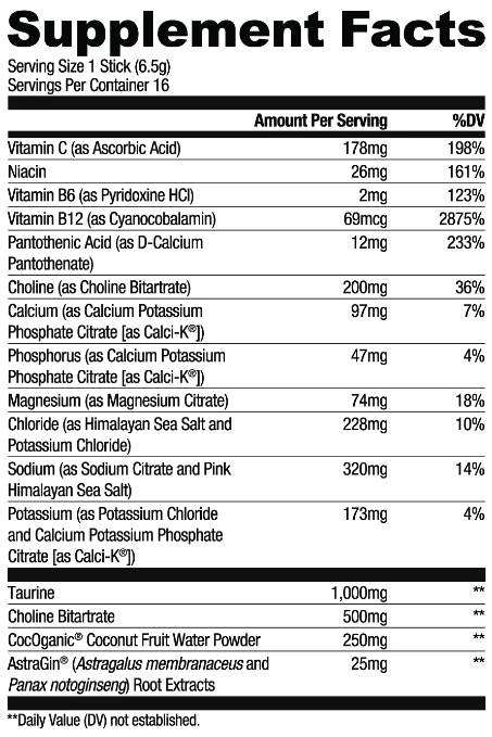 RYSE Hydration Sticks съдържат пълен спектър от електролити над 900 mg+, включително калций, фосфор, магнезий, хлорид, натрий и калий, за поддържане на правилния баланс на течности. Витамините B3, B6, B12 и C подпомагат клетъчната енергия и здравето на имунната система. CocOganic® (250 mg) е органичен кокосов прах, който осигурява естествени витамини и електролити, а AstraGin® (25 mg) подобрява усвояването на хранителни вещества и здравето на червата.