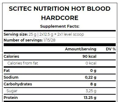 SCITEC Hot Blood Hardcore е иновативен предтренировъчен суплемент, който комбинира ефективни съставки за постигане на максимални резултати в тренировките. Формулата му е проектирана да увеличава мускулното напомпване, да оптимизира енергийното производство и да повишава силата и издържливостта. Благодарение на ключовите аминокиселини, включени в състава, продуктът подпомага производството на азотен оксид, което е от съществено значение за подобряване на кръвообращението по време на физически натоварвания.