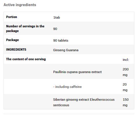 Една доза подкрепя когнитивния фокус, жизнеността и общото благосъстояние. Компонентите са екстракт от гуарана и екстракт от сибирски женшен, които работят синергично за по-добро представяне през деня. Опаковката съдържа 90 дози, като една доза е 1 таблетка дневно.