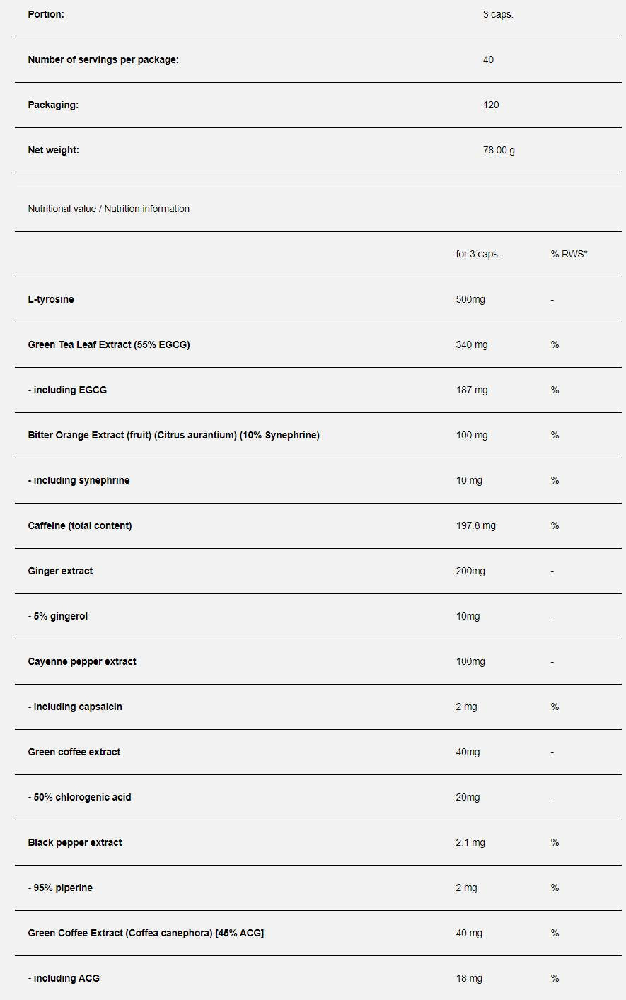 Високоефективен фет бърнър, чийто състав се базира само на доказани и безопасни съставки. Продуктът съдържа голям брой растителни екстракти. Идеален избор за хора, желаещи ефективно да понижат и контролират своето телесно тегло. Суплементът засилва метаболизма, като по този начин се повишава термогенезата, потиска се апетита и се осигурява достатъчно енергия за физическите натоварвания. Добавката съдържа високо количество кофеин (200 мг на доза) и затова не се препоръчва за деца, бременни или кърмещи жени.