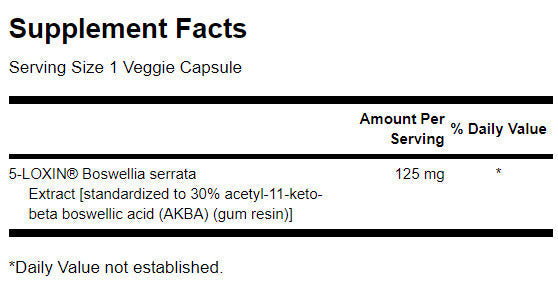 Босвелия серата (Boswellia serrata) е една от най-широко изследваните билки, чиито ползи за здравето са широко признати. Но при билковите добавки винаги съществува един риск - различните колебания в състава могат да повлияят на неговата ефективност на продукт. 5-Loxin® е стандартизира екстракт от Босвелия серата, който съдържа патентован състав, гарантиращ осигуряването на постоянно количество от основната активна съставка във всяка веге капсула.