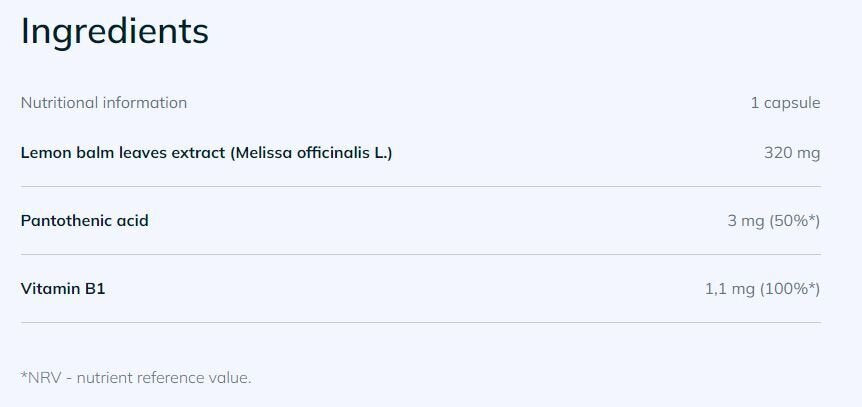 Съставки: екстракт от листа от маточина (Melissa officinalis L.), пълнител – микрокристална целулоза; противослепващи агенти – магнезиеви соли на мастни киселини, силициев диоксид; калциев пантотенат – пантотенова киселина, тиамин хидрохлорид – витамин B1, капсула (компонент на черупката – желатин, хранителен оцветител – E 171)