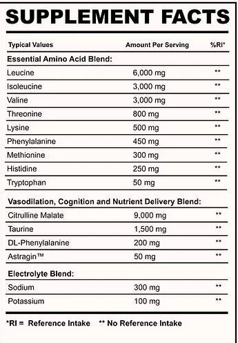 Съставът включва BCAA комплекс, т.е. три дълговерижни аминокиселини: левцин, валин и изолевцин, както и такива съединения като: лизин, треонин, фенилаланин, метионин, аргинин, хистидин и триптофан.