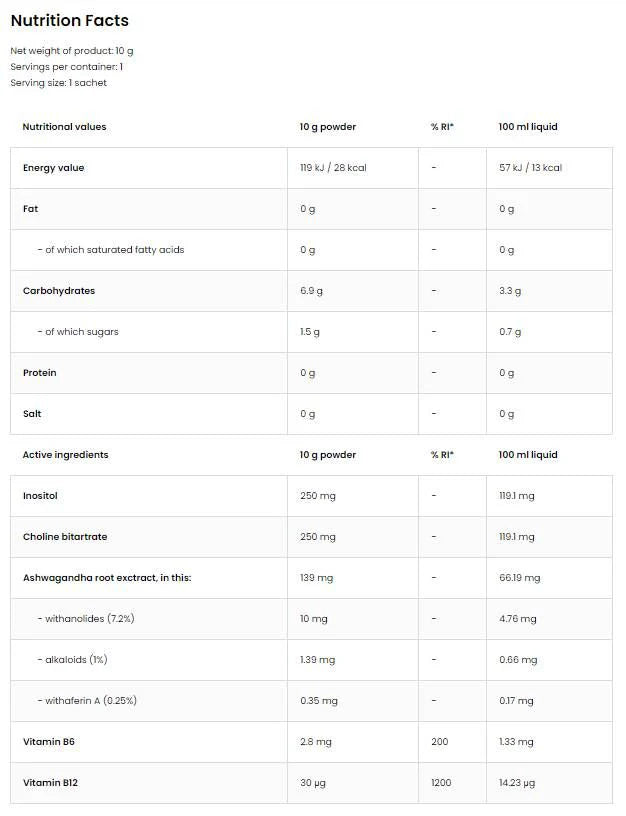 Сашето включва инозитол, холин битартрат, както и екстракт от корен на ашваганда. Всички тези вещества насърчават мозъка да действа и подпомагат когнитивните функции. Допълнителният елемент в сместа - витамин В6 - подсилва въздействието съставките.