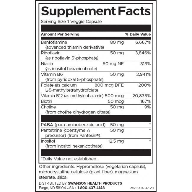 Това е един от най-добрите комплекси с b-витамини на Суонсън, който се отличава с висока активност и бионаличност и гарантира по-добро усвояване от организма. Високоенергийният активен B-комплекс предотвратява загубата на хранителни вещества, които често се изчерпват тогава, когато се намираме под стрес. Тази усъвършенствана формула се грижи активно за здравето на нервната система, както и за здравето на имунната и сърдечно-съдовата система. Тя също така подобрява настроението и се грижи за емоционалното здраве.