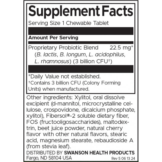 • Всяка дъвчаща таблетка съдържа 22.5 мг (3 милиарда CFU) Патентована пробиотична смес (B. lactis, B. longum, L. acidophilus, L. rhamnosus)