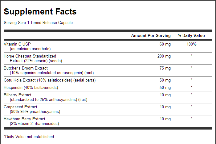 Краката ви държат изправени. Сега е време и вие да ги поддържате. Този продукт на Свансон съдържа бодлив залист, боровинка, глог, за да подпомогне здравото кръвообръщение, а дивият кестен и готу кола подпомагат здравите вени и капиляри. Маслото от гроздови семки защитава колагена, необходим за здрави артерии, а биофлавоноид хесперидин повишава съпротивителните функции на организма.