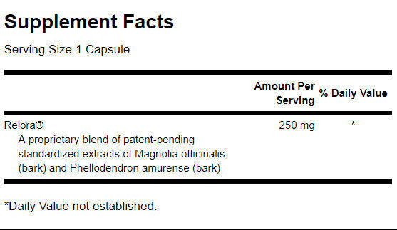 Съставки: Relora® Патентована смес от патентовани стандартизирани екстракти от Magnolia officinalis (кора) и Phellodendron amurense (кора)