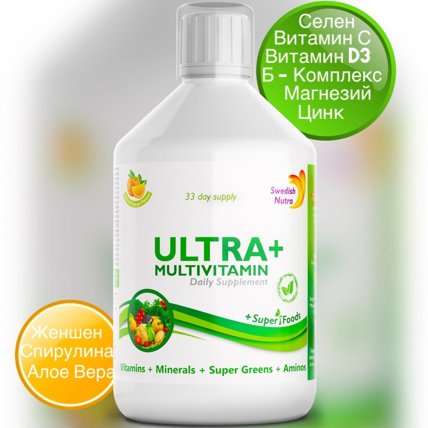 Течни витамини Ултра+ са течни и лесни за прием. Имат приятен портокалов вкус. Една бутилка от 500 мл стига за 33 дни. Изключително богата формула, предназначена да осигури на тялото висока доза витамини, минерали и бленда от супер храни.