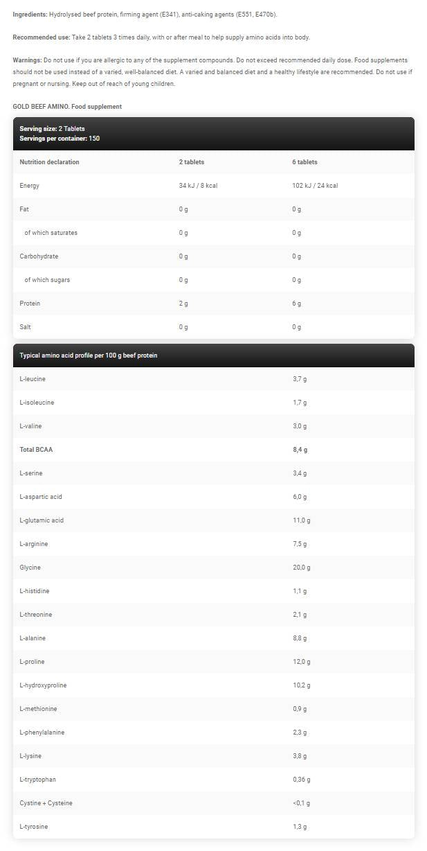 Какво е специално в съдържанието на Kevin Levrone Gold Beef Amino: → Аминокиселинен профил: Левцин, изолевцин, валин (BCAA), глутамин, аргинин и други есенциални аминокиселини.