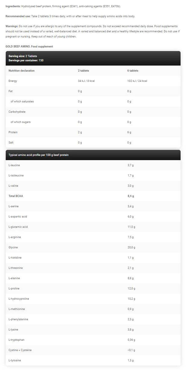GOLD Beef Amino на Kevin Levrone е високопотентен източник на аминокиселини и то не какъв да е, а на висококачествени аминокиселини, които са извлечени от телешки протеин.
