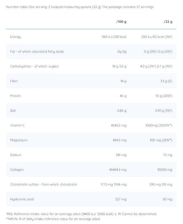 Продуктът съдържа и хиалуронова киселина, която като антиоксидант има ефект на задържане на вода, който подпомага хидратацията на съединителната тъкан (включително кожата и ноктите), за да останат по-здрави и по-гъвкави. По подобна причина допълнихме комплекса с активни агенти с 1000 мг витамин С, който доказано подпомага ускоряването на възстановяването на кожата и възстановява стегнатостта на кожата.