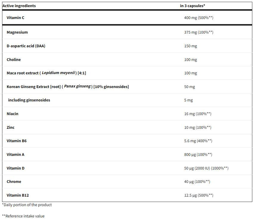Съдържа широк спектър от витамини и минерали, допълнен с D-аспартаминовата киселина (DAA), мака и женшен, които допринасят за енергия, издръжливост и нормален хормонален баланс. Мултивитаминът е подходящ за спортисти, активни хора и за тези с натоварен ритъм, които търсят комплексна ежедневна подкрепа.
