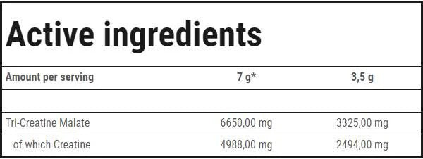 СЪСТАВ : три-креатин малат (95%); средство против слепване – силиконов диоксид; подсладител - сукралоза; аромати; сгъстители – целулозна гума, ксантанова гума; цвят за вкус на ананас – бета-каротин; цвят за вкуса на грейпфрут – азорубин.