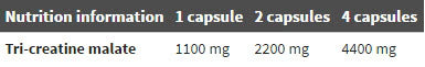 TCM 1100 Mega Caps съдържа висококачествен креатин малат, оптимизиран за бързо усвояване и стабилност в стомаха. Комбинацията от креатин и молекула малат цели постигането на стабилна и устойчива форма на креатина с по-силен анаболен ефект, което допринася за подобрена мускулна работа и възстановяване. Формулата е изключително стабилна и устойчивa в киселата среда на храносмилателния тракт, което улеснява доставянето до мускулните клетки.