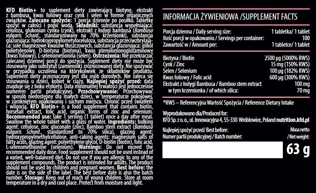 Biotin+ от KFD е първокласен комплекс от съставки, предназначен да поддържа здравето на косата, ноктите и кожата и да подпомага функциите на щитовидната жлеза и имунната система.
