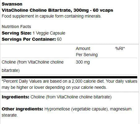 VitaCholine Choline Bitartrate 300 mg 60 капсули
