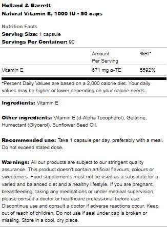 Holland & Barrett Natural Vitamin E 400 IU са естествена форма на витамин Е, която помага за защита на клетките от оксидативен стрес. Витамин Е може да се намери в голямо разнообразие от храни, като слънчогледови семки, фъстъци, лешници, бадеми, броколи, спанак, киви, домати, манго.