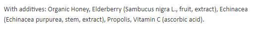 Съставки: Био Пчелен мед, Бъз (Sambucus nigra L., плод, екстракт), Ехинацея (Echinacea purpurea, стрък, екстракт), Прополис, Витамин C (аскорбинова киселина).