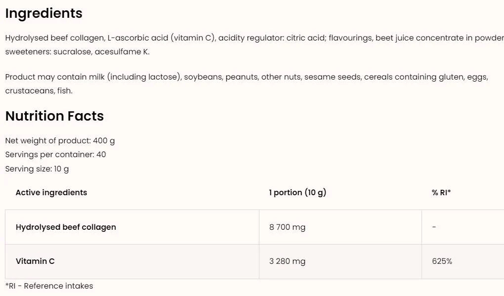 Колагенът е основен структурен протеин в нашето тяло, който играе ключова роля за здравето на кожата, ставите и други тъкани. Добавянето на Витамин C в този продукт не само повишава усвояването на колагена, но също така подпомага образуването на нов колаген в организма. С редовен прием на този прах, можете да се насладите на подобрена еластичност на кожата, по-здрави коси и нокти, както и на по-здрави стави.
