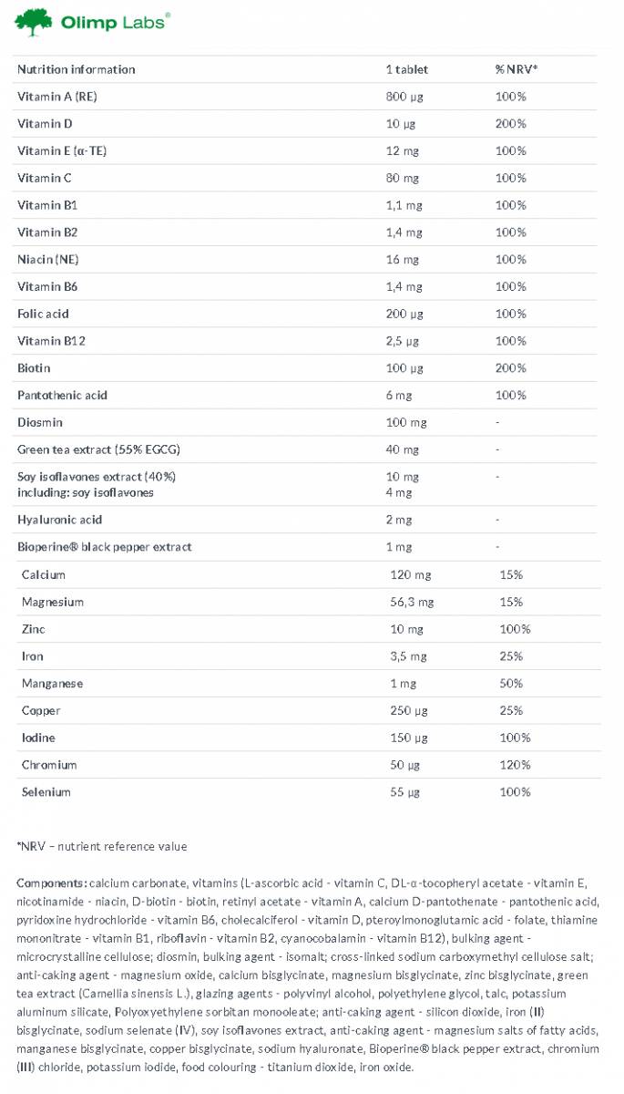 Формулата е допълнена с соеви изофлавони, екстракт от зелен чай, хиалуронова киселина и диосмин както и Bioperine ® черен пипер екстракт.