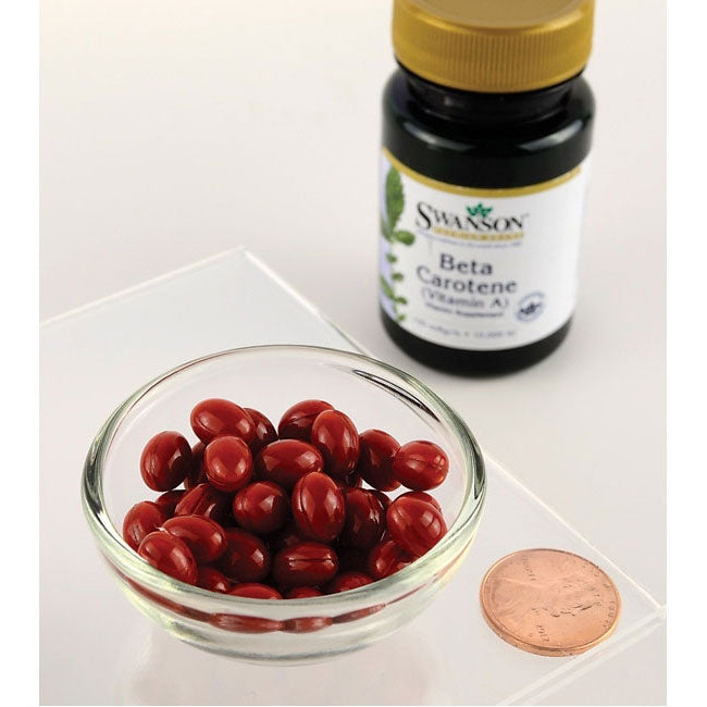 Вземете Бета Kаротен (Витамин А) от Суонсън и подобрете изключително здравето на кожата и очите си. Бета каротин е растителен пигмент, известен още като каротеноид, който притежава доказани антиоксидантни ползи. Бета каротинът е форма на Витамин А, преобразува се във витамин А в червата и затова се нарича още провитамин А. Това вещество се открива основно в растения като моркови, сладки картофи, тиква, спанак и къдраво зеле, и плодове като пъпеши и кайсии. Бета каротинът е различен от животинската форма на витамин А, която се намира в храни като яйца, черен дроб, сирене и пълномаслено мляко. Приемът на Бета каротин поддържа оптимални нива на витамин А, което е основен фактор за здравето на очите, имунната система, растежа и развитието на организма (особено за децата), здравето на кожата. Бета каротинът намалява степента на остаряване на кожата, снижава риска от нощна слепота и сухота в очите. Бета каротинът е важен и мощен антиоксидант, който защитава клетките (особено клетките на кожата и ретината). Той също се използва за лечение на генетичната болест Протопорфирия, която се характеризира с хипер-чувствителност на кожата към слънчевата и флуоресцентната светлина, което води до сърбежи и зачервявания на кожата. Трябва да се внимава с приемането на високи дози Бета каротин особено ако потребителите са пушачи или приемат сериозни дози алкохол. Големият прием може да накара кожата да изглежда жълтеникава или леко оранжева, което е временно и безобидно. Бета каротинът на Суонсън ще подобри здравето на кожата и очите, доставяйки 6 мг Бета каротен във всяка капсула.