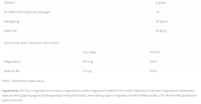 • Подходящ за активни хора: Магнезият е важен за правилния синтез на протеини, особено за физически активни индивиди.