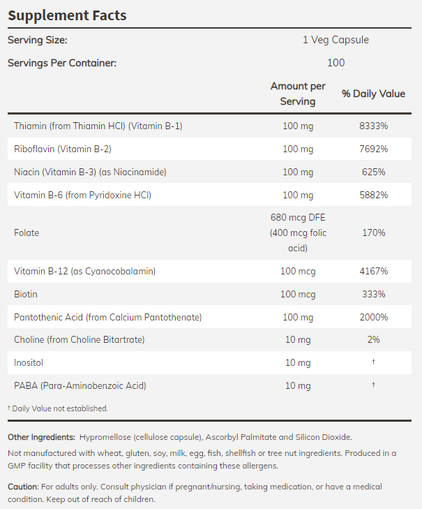 Предозирането с витамин B е невъзможно, защото излишните количества се изхвърлят от тялото. Витамините в B-100 имат силни синергистични свойства, поради което следва всички да се приемат заедно. Освен, че са силни като комплекс, повечето от витамините от комплекса на NOW имат и индивидуални свойства: