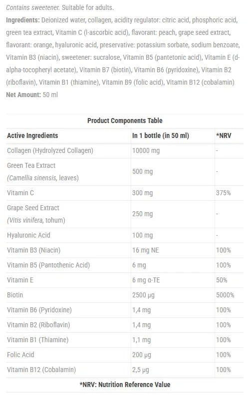 Течната формула съдържа 10,000 mg хидролизиран колаген и 100 mg хиалуронова киселина, които подпомагат еластичността на кожата и намаляват фините линии. Антиоксидантната защита идва от екстракт от зелен чай и гроздови семки, които помагат за защитата на клетките от оксидативен стрес. Витамин C, E и B остават свежи и активни до момента на прием, за да допринесат за цялостното здраве. Готов за консумация! Без разтваряне, без добавена захар, без компромис с качеството!