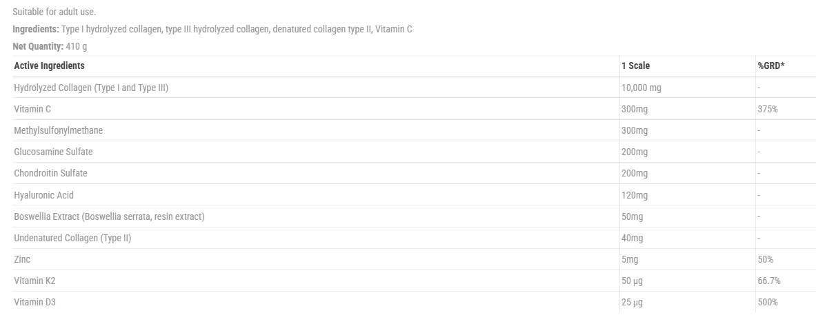• 10,000 mg хидролизиран колаген (тип I и III) – подпомага здравето на ставите, костите и хрущялите