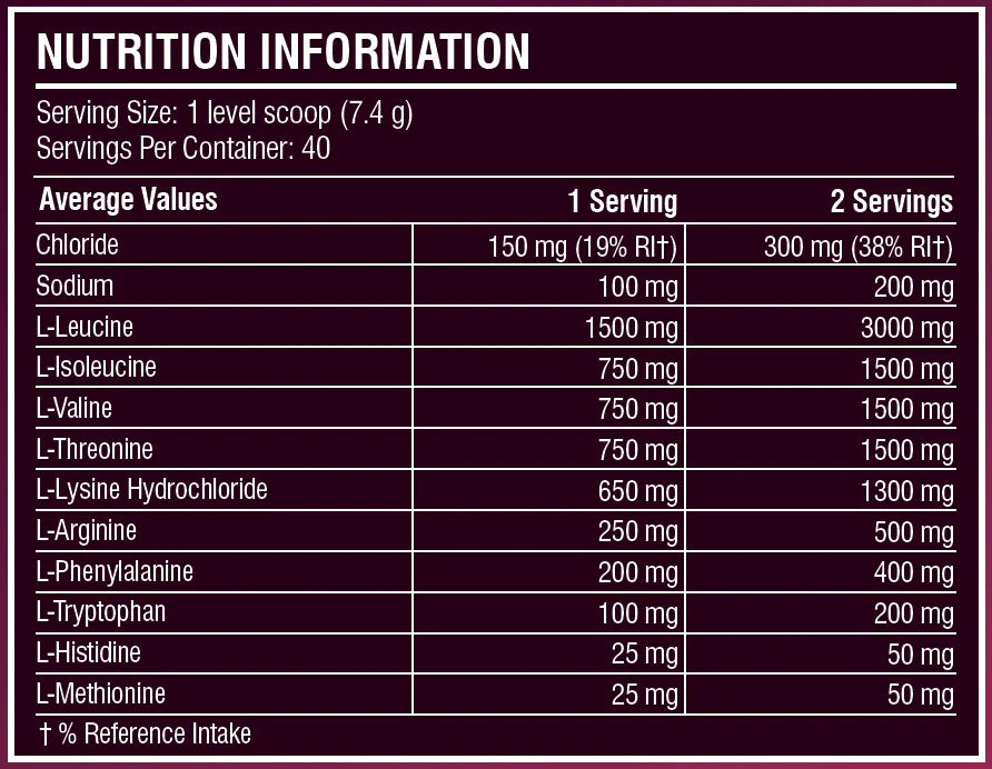 Съставки: L-левцин, L-изолевцин,L-валин , L-треонин, L-лизин хидрохлорид ,L-аргинин ,L-фенилаланин ,L-триптофан ,L-хистидин ,L-метионин
