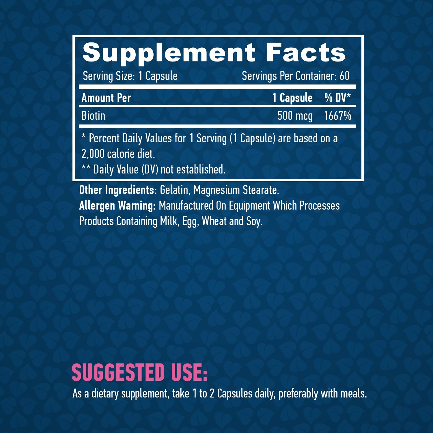 Една доза от Biotin 500 mcg / 60 Caps е 1 капсула, която предоставя необходимата дневна доза за поддържане на метаболитните функции и енергия. Продуктът е разработен за удобство и надеждност в ежедневието на активни хора и тези, които се грижат за здравето на косата и кожата.