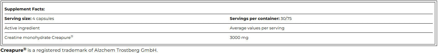 Creapure® креатин монохидрат е патентована немска суровина с висока чистота, която подпомага синтеза на енергия в мускулите. На доза от 3000 mg Creapure® креатин монохидрат продуктът спомага за подобряване на вътрешната енергия и мускулния потенциал по време на високоинтензивни натоварвания. Формулата е удобна за прием под формата на капсули и не съдържа захари или изкуствени съставки, което я прави подходяща за редовно използване в спортното възстановяване.