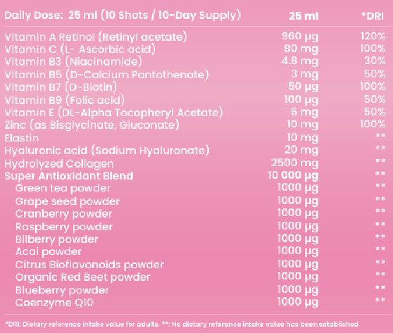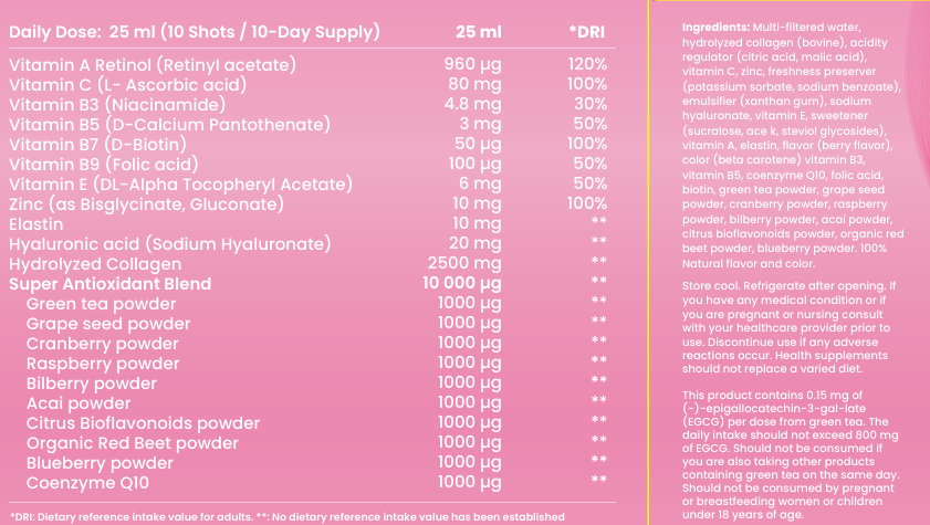 Full composition : Multifiltered water, hydrolyzed collagen (bovine), acidity regulator (citric acid, malic acid), vitamin C, freshness preservative (potassium sorbate, sodium benzoate), zinc, emulsifier (xanthan gum), sodium hyaluronate, vitamin E, sweetener (steviol glycosides, sucralose, ace k), vitamin A, coloring agent (beta carotene), flavor (blueberry flavor), vitamin B5, coenzyme Q10, biotin, green tea powder, grape seed powder, cranberry powder, raspberry powder, blueberry powder, acai powder, citrus bioflavonoid powder, organic beetroot powder, blueberry powder. 100% natural flavor and color.