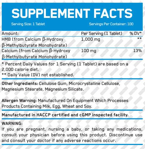 HMB 1000 mg / 100 Tabs е висококачествена хранителна добавка, съдържаща активния метаболит на левцина (HMB), който намалява разграждането на мускулните протеини и подпомага растежа и възстановяването на мускулите.