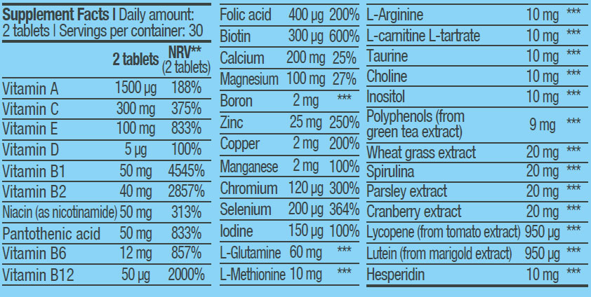 Съчетава пълен набор от витамини и минерали с антиоксидантни съставки, специално подбрани за мъже. Формулата включва аминокиселинна база, плодови и зеленчукови екстракти и антиоксиданти, които подпомагат нормалните функции на организма и поддържат жизненост през деня.