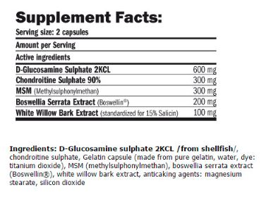 Съставът комбинира глюкозамин сулфат, хондроитин сулфат и MSM с босвелия и салицин, за да подсили здравето на ставите и съединителната тъкан. Глюкозаминът е основен изграждащ елемент на ставната тъкан и хрущяла, а хондроитинът поддържа тяхната гъвкавост и здравина. Boswellia се произвежда в Индия от смолата на дървото Boswellia serrata и подпомага нормалното кръвоснабдяване към ставите. MSM осигурява органично свързана сяра за поддържането на колагенови фибри и антиоксидантна защита. Салицинът от кората на Бяла върба е естествена форма на аспирин и допринася за дискомфорта при ставите.